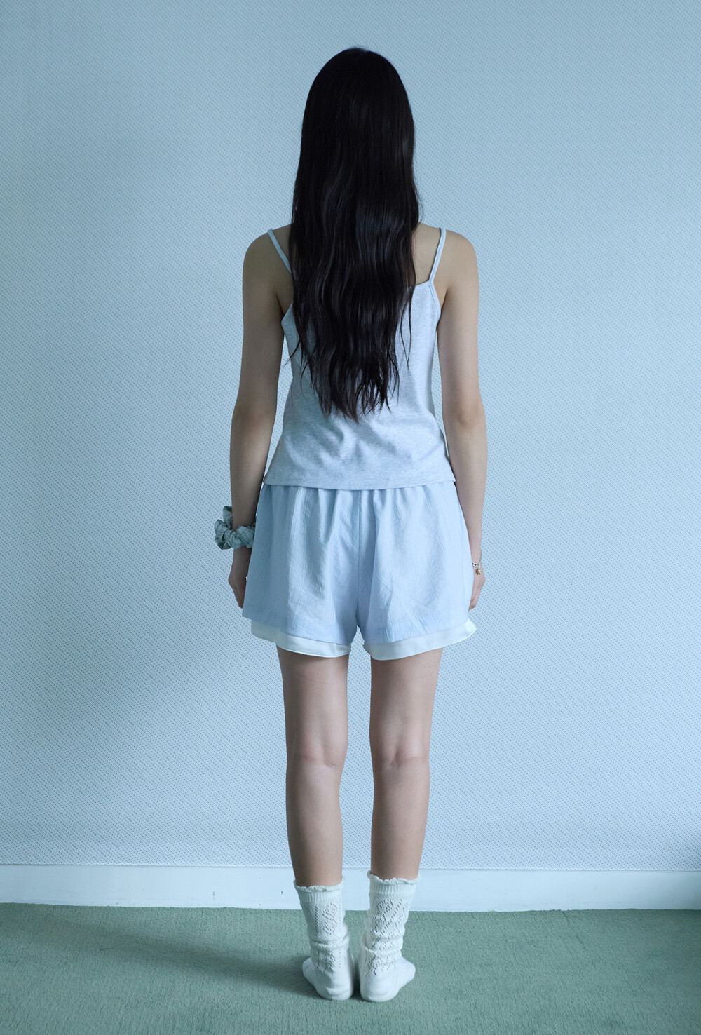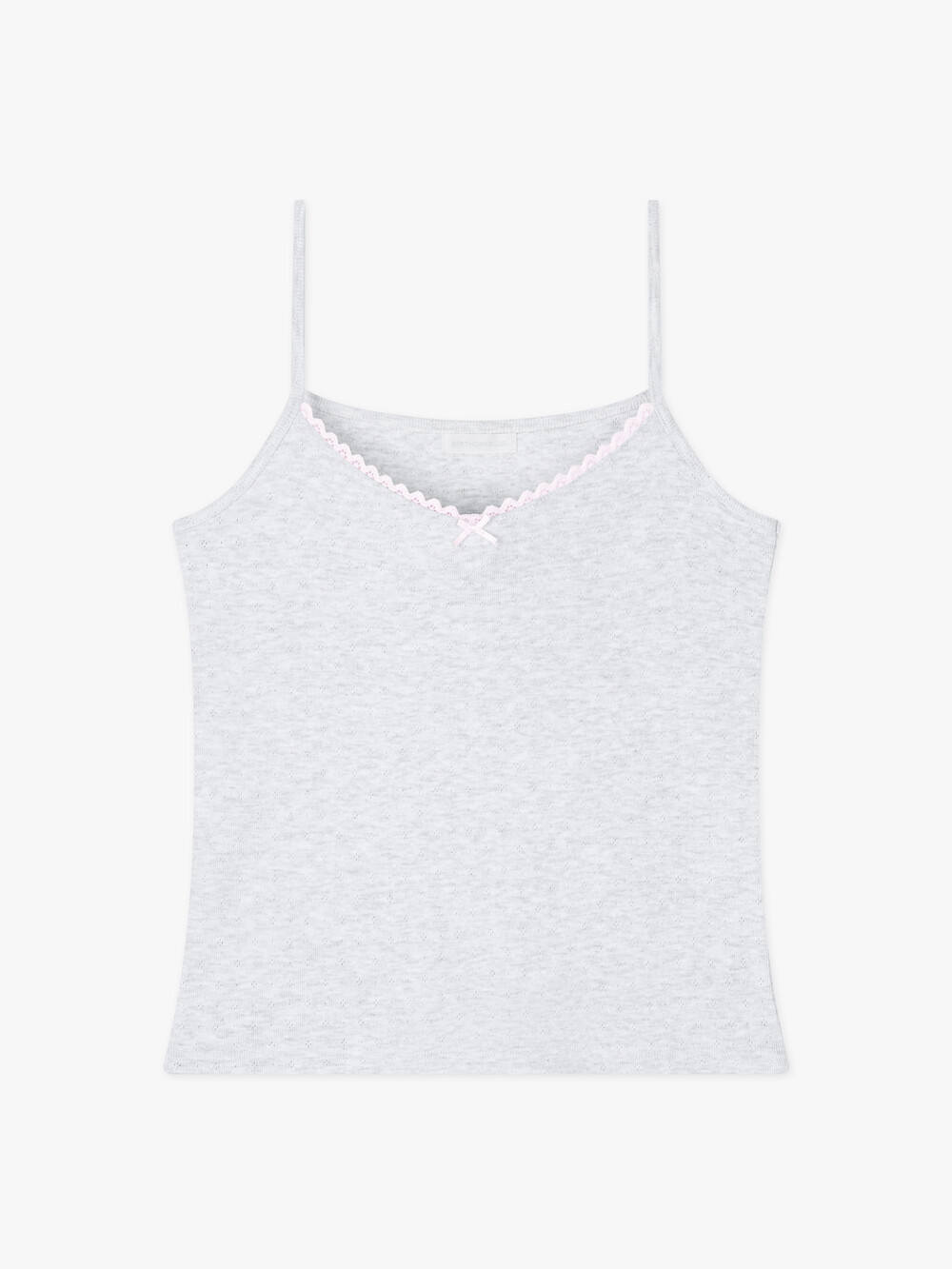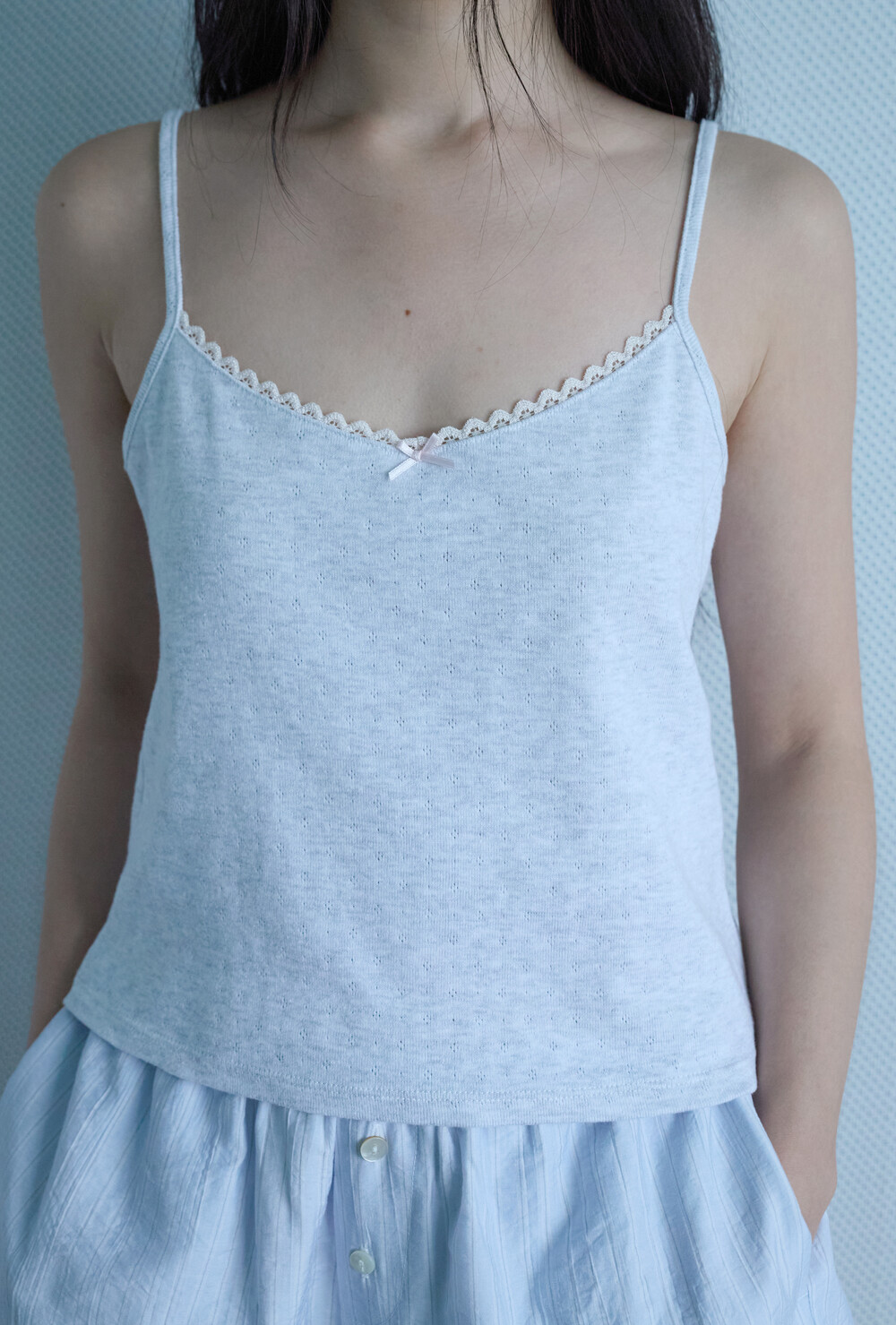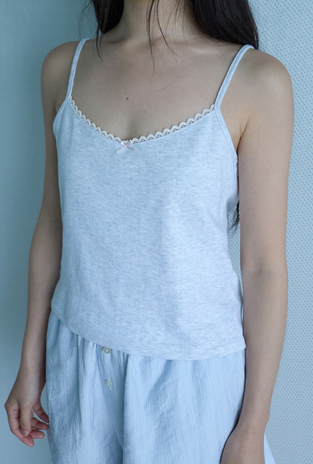 핑크빛 리본과 레이스를 더해 사랑스러운 무드를 담은 슬리브리스 탑입니다.