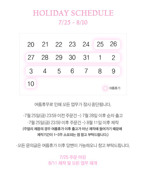 -주문제작 상품의 경우 평균 7-14일(주말, 공휴일 제외) 정도 소요 됩니다.