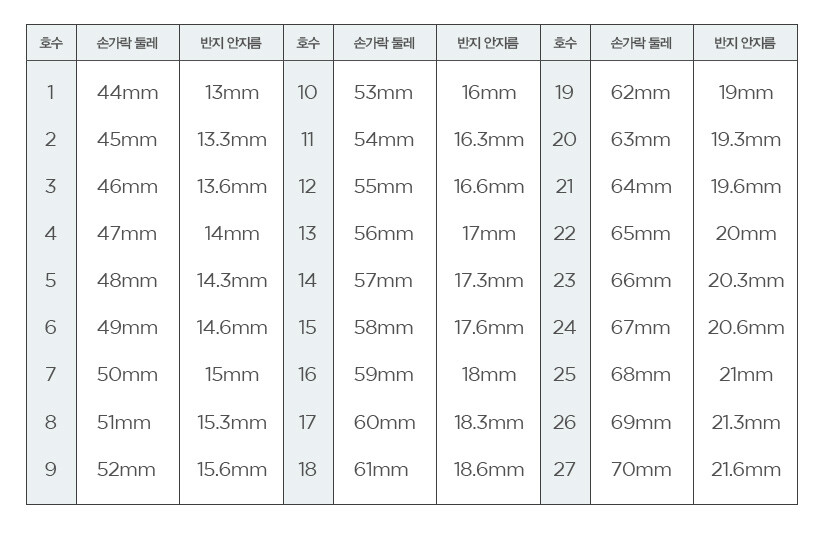 내경(안지름)을 여러 번 확인한 후 아래 사이즈 차트를(반지 안지름) 참고해 주시기 바랍니다.